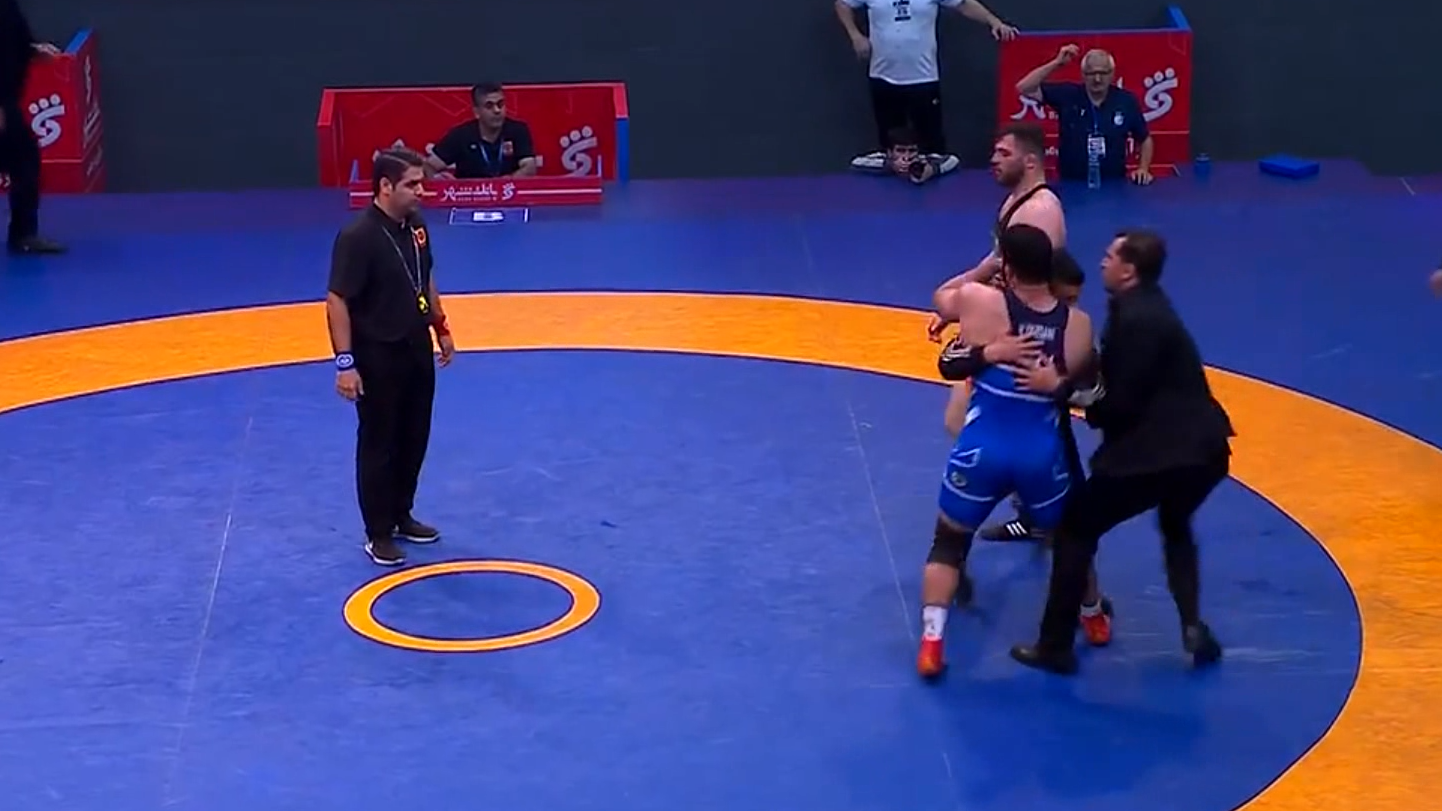 ورود یکی از هوادارن کشتی به تشک و درآغوش کشیدن حسن یزدانی منبع: صدا و سیما ...